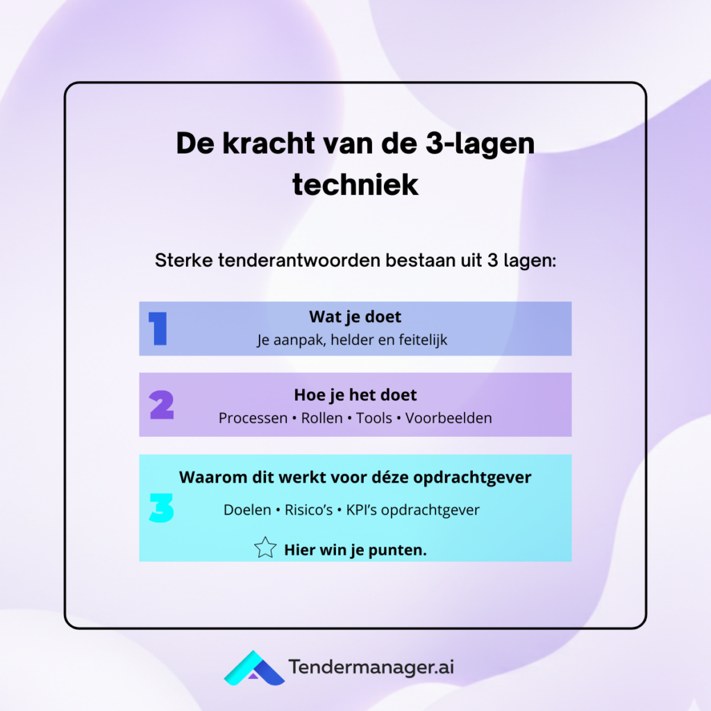 Met TenderManager.ai help je teams om deze drie lagen structureel toe te passen, zodat antwoorden niet blijven hangen in algemeenheden maar écht aansluiten op de beoordeling.
